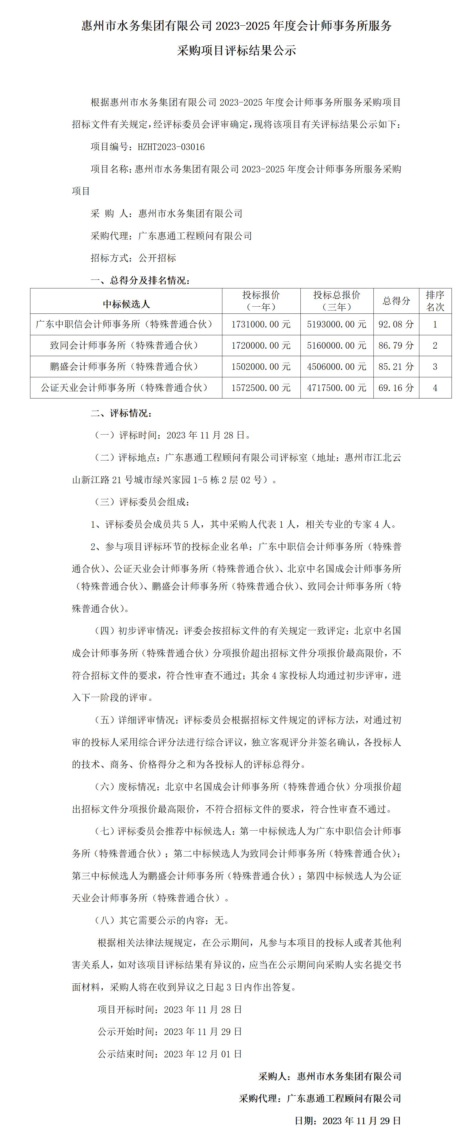 惠州市水務(wù)集團有限公司2023-2025年度會計師事務(wù)所服務(wù)采購項目評標結(jié)果公示