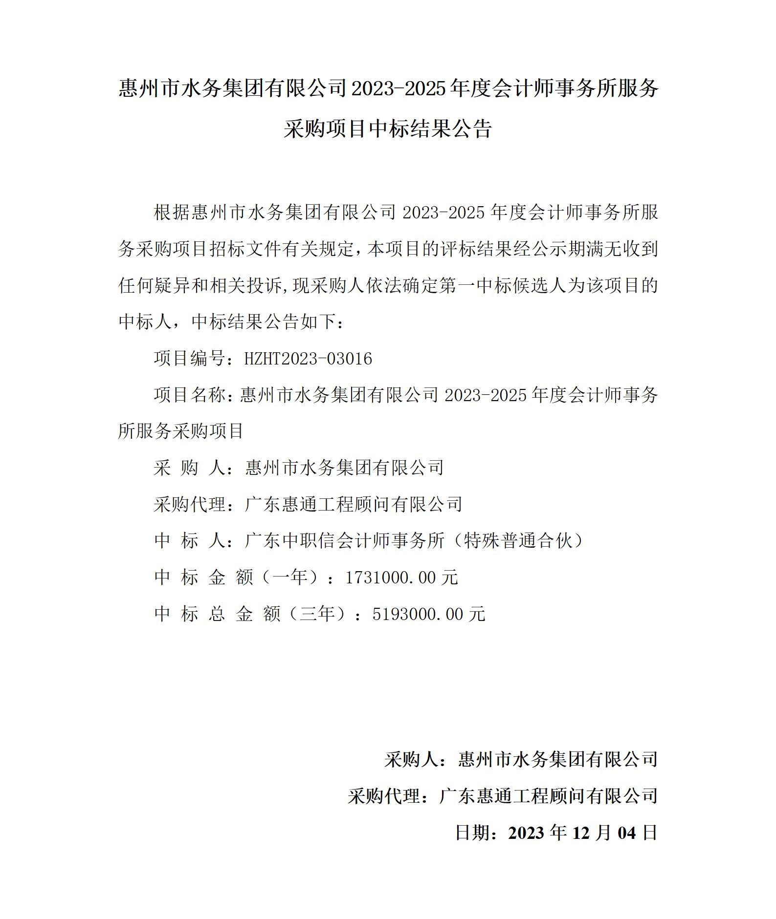 惠州市水務集團有限公司2023-2025年度會計師事務所服務采購項目中標結果公告