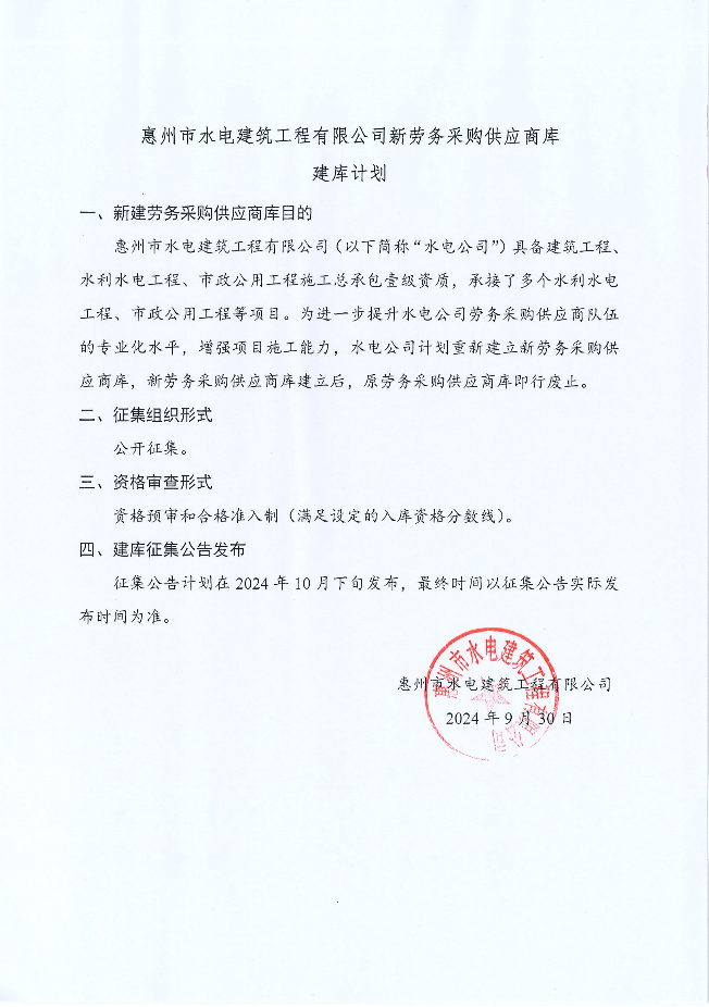 惠州市水電建筑工程有限公司新勞務采購供應商庫建庫計劃