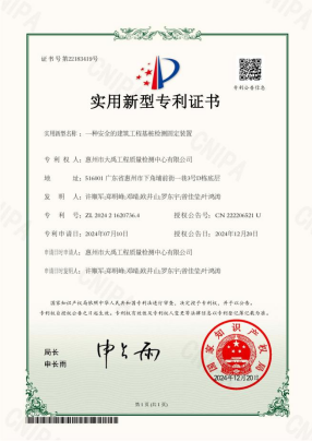 近日,惠州市大禹工程質量檢測中心有限公司在科技創(chuàng)新方面再創(chuàng)佳績,獲得了一項名為“安全建筑工程基樁檢測固定裝置”(專利授權公告號:CN 222206521 U)的實用新型技術專利,其實用性、創(chuàng)新性和安全性在建筑工程基樁檢測領域具有廣泛的應用前景。這一專利的獲得,不僅為大禹檢測公司帶來了更多的技術儲備,也為提升建筑工程基樁檢測的安全性和準確性提供了有力保障。